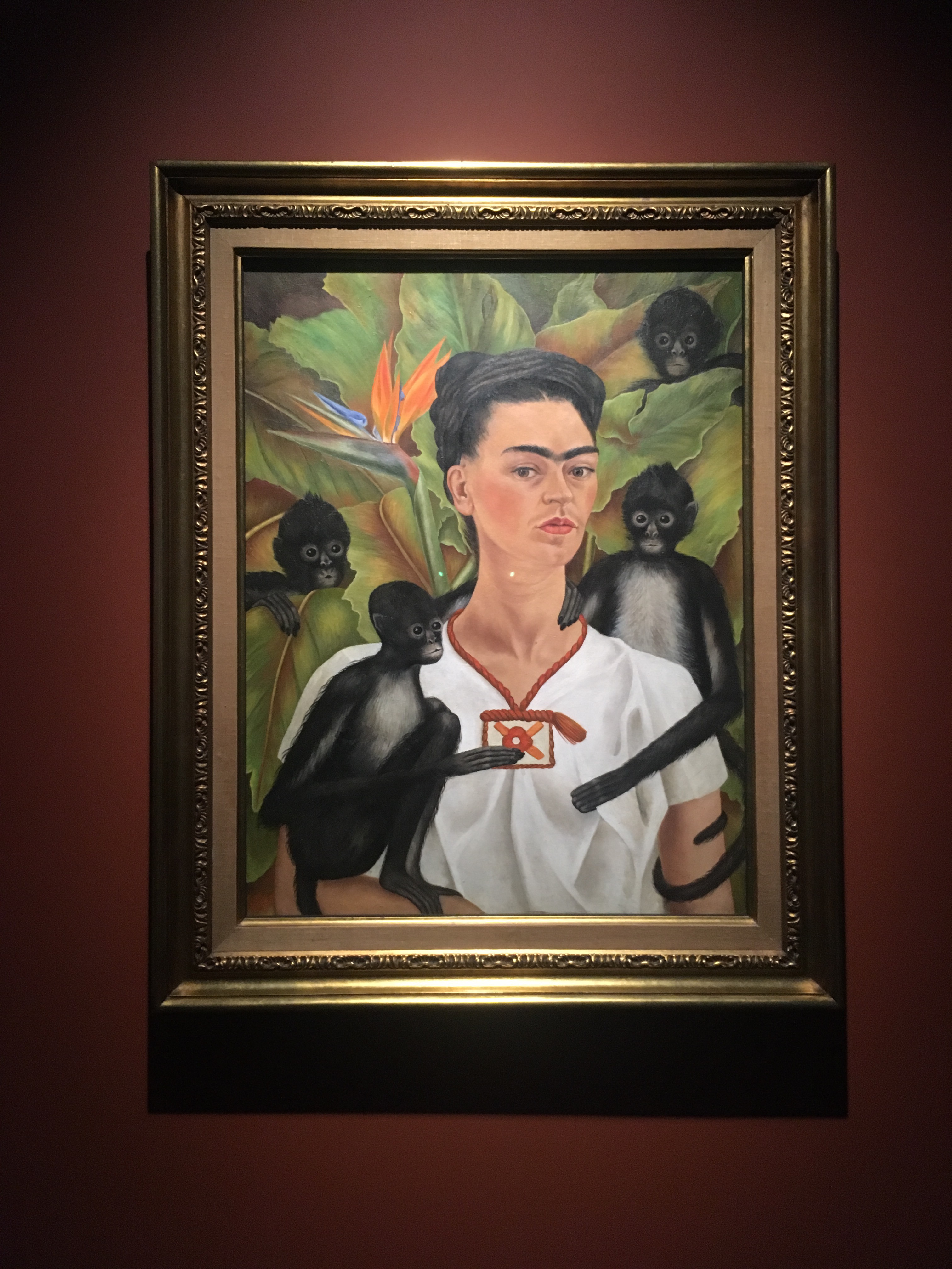 La mostra al Brooklyn Museum fa sfoggio di alcuni di questi dipinti, o retablos, piccoli quadretti su latta colorati e folkloristici, presi in prestito dalla collezione Kahlo-Rivera. I retablos ci ricordano che Frida stessa ne produrrà alcuni, come il famoso “Sopravvissuto” portato in mostra alla galleria newyorkese Julien Levy sulla 57esima nel 1938 che ritrae un idolo pre-colombiano in piedi in un deserto. In mostra solo pochi dei suoi numerosi autoritratti, il soggetto preferito di Frida è in fondo lei stessa, e la sua dedizione a imbellettare e imbellettarsi. Si dice che fosse sempre vestita bene, anche quando era costretta a letto e non aspettava ospiti, si sa che la sua casa era piena di specchi per far in modo di potersi guardare e nel caso ‘darsi una sistemata’.